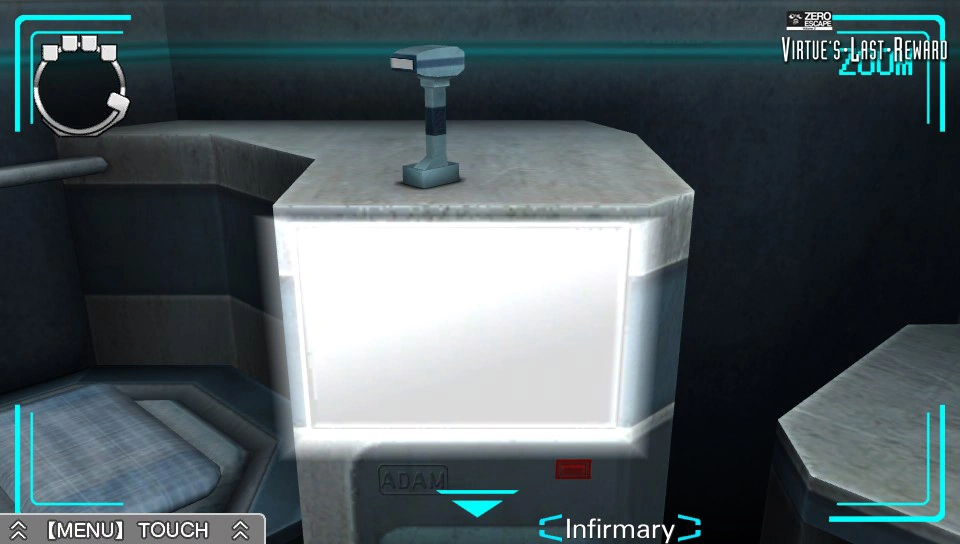 There is an ADAM located in the Infirmary on Rhizome 9. Luna is the only one of the nine players who is capable of using the ADAM, since she claims to have a medical license. She uses it to scan Akane Kurashiki's body, Quark, Alice, and Sigma Klim. The ADAM is also used to get both the escape and file passwords when the Infirmary functions as an escape room by scanning the bedsheets found during the puzzle.