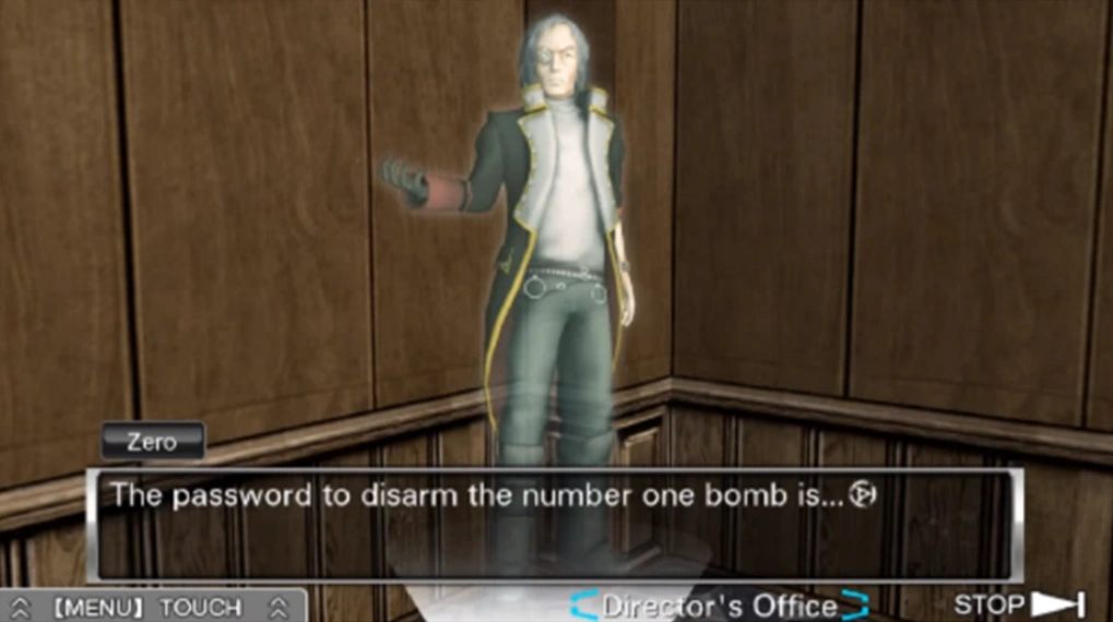 Dio states that they need the password input device, and Phi says that they have resolved the issue, with Sigma showing them the password input device, which they received from the safe after finishing the Control Room puzzle, which they were previously unsure of what that was, and that Phi tested it after Clover left. Tenmyouji asks why it was in the safe, and Clover wonders if Zero Sr. put it there, and K says that would mean Zero Sr. set up the bombs. Though Luna finds it odd since Zero Sr. wants us to play the Nonary Game, Dio says that it might be rigged to blow if someone violates the rules, but Luna replies saying that the bracelets should be suffice. Everyone is confused but Phi is sure that someone in the Infirmary set up the bombs. Phi states they should interrogate whoever set up the bomb to get the passwords. Phi asks whoever set up the bombs to admit it, and since no-one does, she decides the search everyone, but Sigma says he knows who did, much to Phi's surprise and identifies Dio.