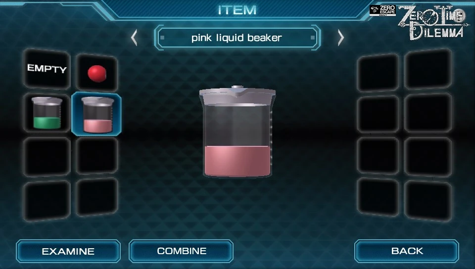 This minigame requires the player to press four buttons in order to open a locked cabinet. The solution is found by examining the liquids inside the test tubes. The number of cells grouped together shows how many times to press the buttons.