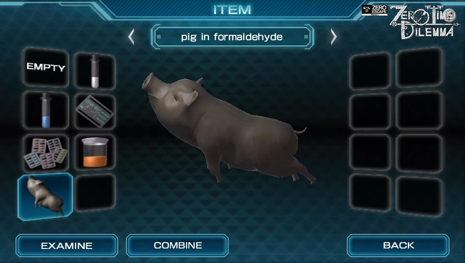 A vision of the members of Q-Team being executed is shown, but it turns out to be a dream as Q wakes up screaming in the Biolab. He discusses his dream, but Eric dismisses it as just a bad dream. The exit seals shut and Mira wakes up as well. While searching their surroundings, Eric becomes freaked out by a pig preserved in formaldehyde and Q and Mira theorize on the purpose of the lab. A computer monitor comes on with one instruction - "slash the pig's stomach".