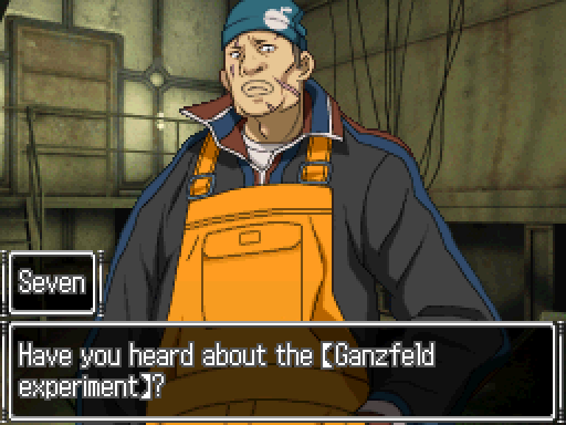 Seven mentions and explains the Ganzfeld Experiment to Lotus and Junpei in the Torture Room in the run up to the Submarine Ending.