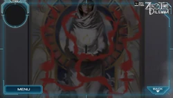 Carlos, Junpei and Akane wake up in the infirmary and discover they aren't locked in. As they are pondering why they are in the room, Zero greets them on the loudspeaker. He tells them a story about how a woman was killed and an innocent man was convicted and executed for the murder. The man's wife took her own life and left behind two young children. A few years later, DNA evidence proved that the man was telling the truth about his innocence and the true culprit was unknown and still remains at large. Zero says that this was unfair and warns that calamity can occur without warning. He informs them that six of them have been injected with poison and that the antidote can be found within the room, forcing them to begin their search.