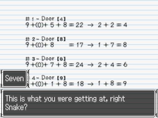 Junpei enters Door 8 with Lotus and Clover and investigates the Laboratory. Junpei learns of prosopagnosia from Lotus. Using her amazing programming skills, Lotus brute forces a computer and helps her group escape. If Junpei chose Door 5 earlier, Clover also tells Junpei about her brother's car accident and that his left arm is fake.