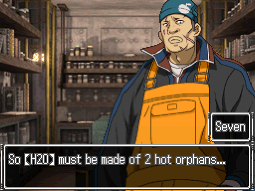 While looking through a chemical closet for parts and other hints, Junpei turned to leave and found Seven not leaving, but instead thinking about something. Seven explained that he was just looking at a bottle of EDT and told Junpei a story about how EDT crystals hydrate. Junpei asked him if he knew anything about Ice-9 and Seven started muttering about a woman on the ship and a Titanic survivor named Dashiell Gordain who bought her and the Gigantic. Seven told him that he couldn't remember anything else and they both left to meet up with Clover.