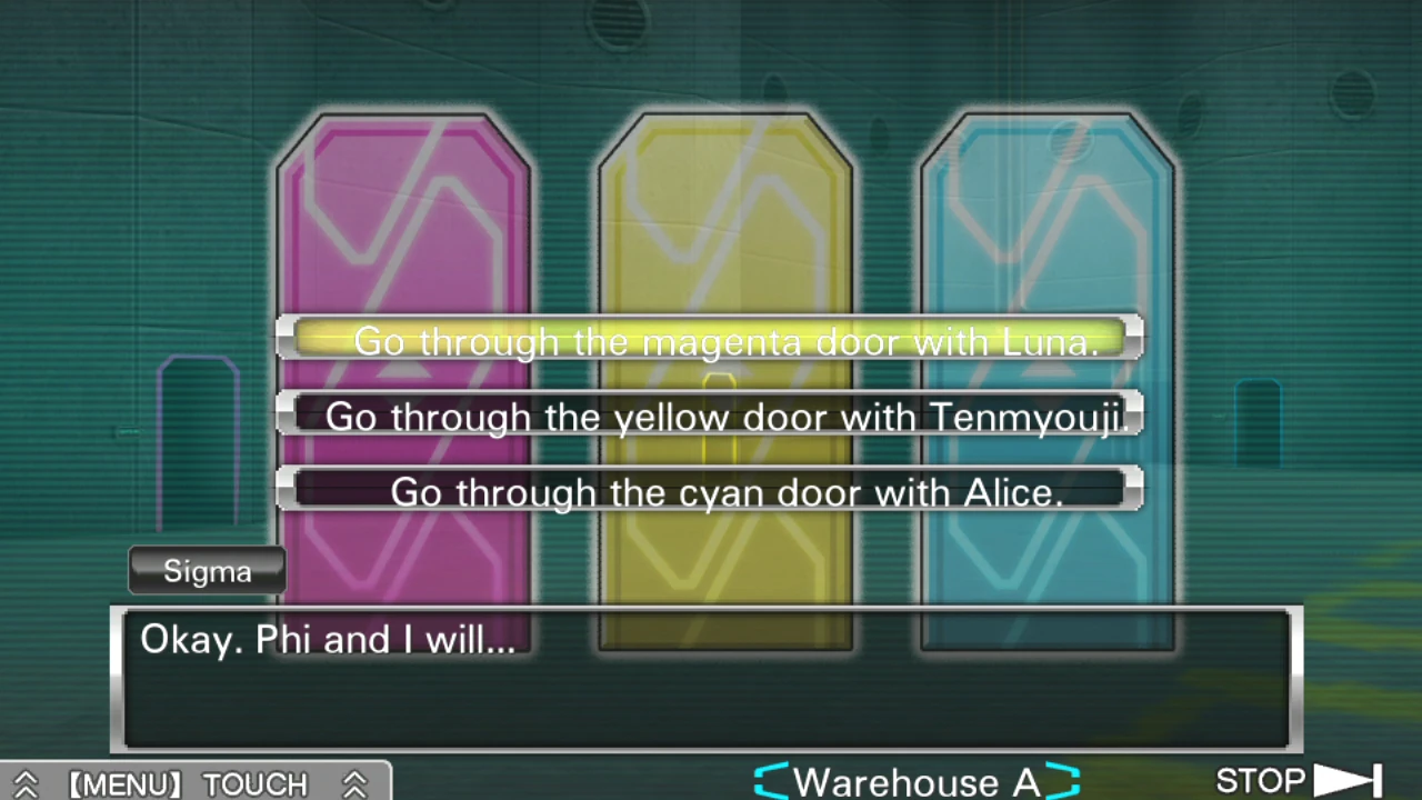 Like the AB games held against Alice and Tenmyouji in Round 1 in VLR (as well as the Round 2 AB Game against Phi in VLR), Junpei will always pick the opposite of what Carlos picks. After seeing both of the timelines where the roles of Ally/Betray are changed, it is at this point that Carlos learns he is an esper and Akane explains to him the nature of his ability to SHIFT and the story continues.