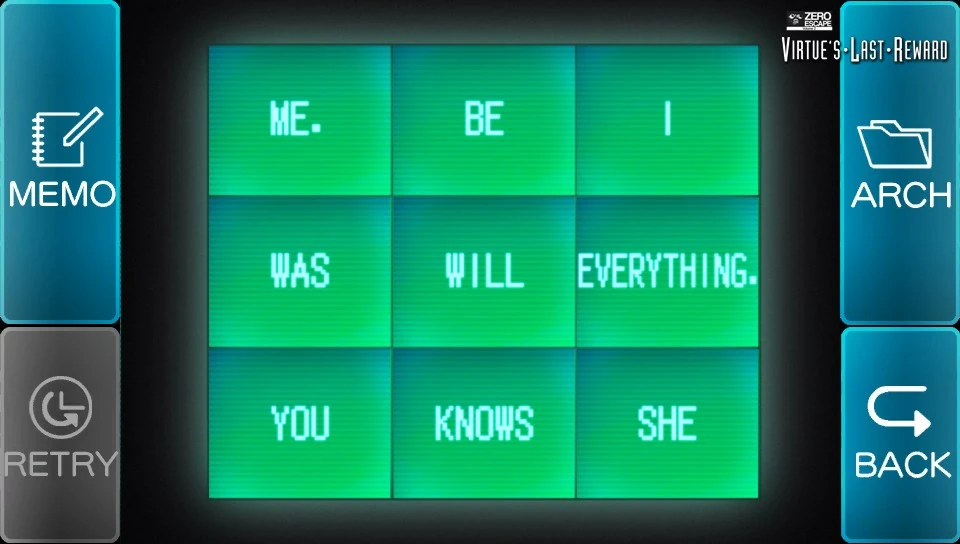 This minigame is accessed after completing the "Hourglass Determination" and the "Cabinet Color Shift" minigames. This minigame requires the player to arrange the words on the main monitor in a certain order. However, the player must shut off the words they don't need using the on and off switches for each screen, located on the electrical panel in the room. Depending on which sentence you make, you will receive the Escape or File password.