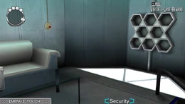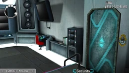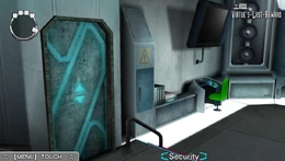 Sigma accesses this room with Phi on Luna's route, after K forces Sigma and Phi to go through one of the white doors by punching them. After recovering, they search the security room and find the star keys and the exit key.
