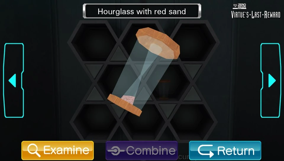 The Hourglass with red sand is found on the left set of shelves on the upper floor of the room. The number and color of the hourglass are used as clues in the puzzle at the main monitoring station. This item is also used in the following novel section.
