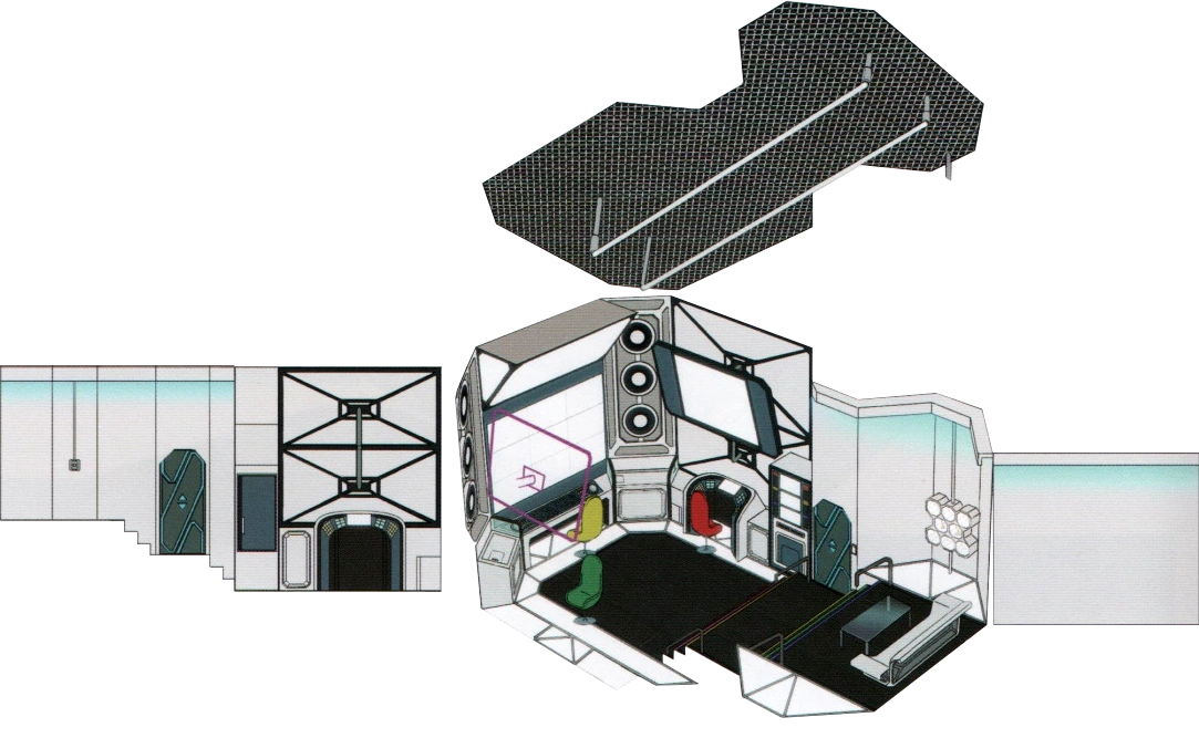 The Security room has three large computer screens in the front of the room. The center computer has three speakers on both the left and right sides of the monitor and shows what is occurring in real time in the facility. Each computer has a different colored chair: green on the left, yellow in the middle, and red on the right. Each computer monitor has a large screen above it. To the left of the green chair is a device that enables or disables the monitors in the front area of the room. There are stairs that divide the room, going up towards the back. Each step has a different colored strip of light on its front. In the back of the room, there is a light switch shaped like a lion's face with a red button in its mouth. The button has a Sun symbol on it. Near the switch stands a small glass table and a gray sofa.