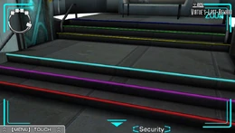 This minigame is played three times in this room: at the left, right, and center consoles. The passwords for each of the consoles can be found on the stairs in the room after the lights have been turned off. The passwords are displayed beneath steps of different colors, so the player needs the green, yellow, and red passwords. The remaining passwords on the steps are useless.
