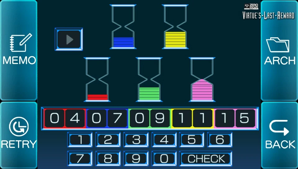 This minigame is accessed after putting the correct password into the central computer in this room. In this minigame, the player must calculate the value for each hourglass on the screen. If the number is a single digit number, then the player must type in a zero. Another way to do this is to count all of the lines of sand in each hourglass, but this is harder in the 3DS version due to the lower resolution.